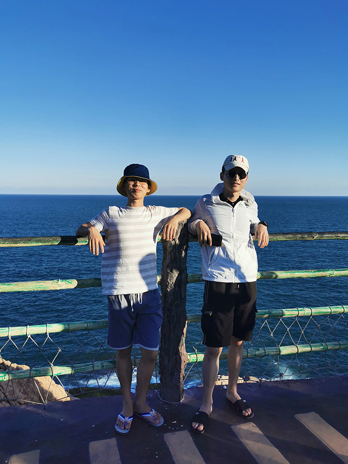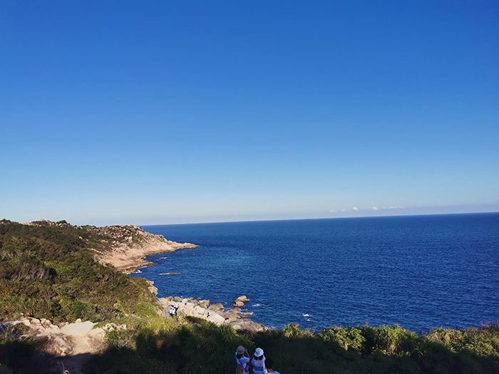 稍作休息后,下午3點(diǎn)多,我們游覽了觀景臺(tái)。這里三面環(huán)海,風(fēng)景如畫?;輺|的雙月灣,由兩片半月形灣畔形成,而這一壯闊美景,只有登頂大星山的觀景臺(tái)才能看到。駐足在雙月灣觀景臺(tái)的最前端,極目遠(yuǎn)眺,藍(lán)天、白云、大海,水天相接,令人心曠神怡。