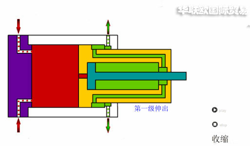 當(dāng)壓力油從無(wú)桿腔進(jìn)入時(shí),活塞有效面積最大的缸筒開始伸出,當(dāng)行至終點(diǎn)時(shí),活塞有效面積次之的缸筒開始伸出。伸縮式液壓伸出的順序是由大到小依次伸出,可獲得很長(zhǎng)的工作行程,外伸缸筒有效面積越小,伸出速度越快。因此,伸出速度有慢變快,相應(yīng)的液壓推力由大變小;這種推力、速度的變化規(guī)律,正適合各種自動(dòng)裝卸機(jī)械對(duì)推力和速度的要求。而縮回的順序一般是由小到大依次縮回,縮回時(shí)的軸向長(zhǎng)度較短,占用空間較小,結(jié)構(gòu)緊湊。常用于工程機(jī)械和其他行走機(jī)械,如起重機(jī)、翻斗汽車等的液壓系統(tǒng)中。