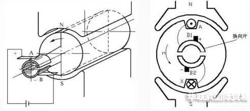一臺直流電機原則上既可以作為電動機運行,也可以作為發(fā)電機運行,這種原理在電機理論中稱為可逆原理。當原動機驅動電樞繞組在主磁極N、S之間旋轉時,電樞繞組上感生出電動勢,經電刷、換向器裝置整流為直流后,引向外部負載(或電網),對外供電,此時電機作直流發(fā)電機運行。如用外部直流電源,經電刷換向器裝置將直流電流引向電樞繞組,則此電流與主磁極N.S.產生的磁場互相作用,產生轉矩,驅動轉子與連接于其上的機械負載工作,此時電機作直流電動機運行。