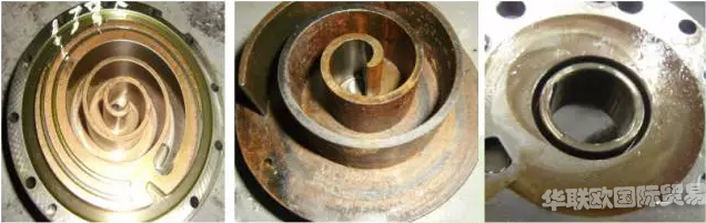 解剖表現(xiàn):機構(gòu)表面輕則鍍銅,重則生銹。(渦盤間隙和滾動活塞與缸蓋、氣缸內(nèi)壁間隙約10~20um,生銹、鍍銅導致間隙減小,摩擦增大。)