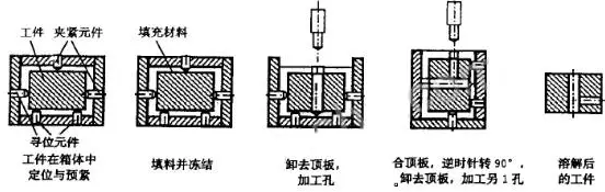 基準自由的零件密封技術(shù)是一種安裝技術(shù)新概念,是PCBF 技術(shù)的發(fā)展。采用RFPE 夾具加工時,當需要進行工序或安裝轉(zhuǎn)換時,通過再一次的材料填充,恢復(fù)工件夾具系統(tǒng)的原有形狀,通過填充實體表面保留工件最初的位置信息,以作為新的安裝過程中工件定位的線索?;赗FPE 技術(shù),提出并研制了一種能夠快速尋位和狀態(tài)記憶的通用夾具系統(tǒng)。