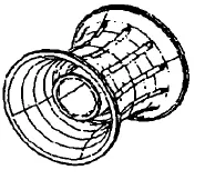 (2) 鞍形轉(zhuǎn)子:這是一個具有雙曲面外輪廓的高速回轉(zhuǎn)件(見圖10)。環(huán)壁薄、精度要求高,由于加工時易于產(chǎn)生變形,傳統(tǒng)生產(chǎn)中采用互為基準、反復(fù)進行工序轉(zhuǎn)換加工成形的方法,不僅加工效率低,而且需要各種專用工裝,采用柱形的RL&SM 通用夾具,通過填料增加了工件的剛性,避免了互為基準反復(fù)加工的工藝過程,減少工序轉(zhuǎn)換次數(shù),提高切削效率,減少了專用工裝的花費,即設(shè)計、制造周期和成本等。