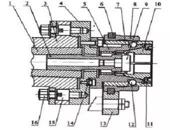 1-錐套 2-定位套 3-主軸 4-過渡盤 5-夾具體 6-瓦 7-夾緊套 8-活動套 9-定位銷 10-彈簧夾頭 11-鎖緊檔圈 12-鋼球 13-撥叉 14-傳動鏈 15-插銷螺栓 16-帶肩螺母