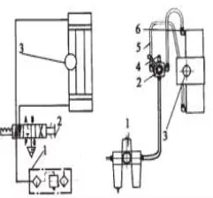 1-氣源處理三聯(lián)件 2-三位四通手動轉(zhuǎn)閥 3-回轉(zhuǎn)氣缸 4-消聲器 5-尼龍管 6-管接頭