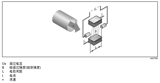 在電磁測量原理中,流動(dòng)的介質(zhì)相當(dāng)于運(yùn)動(dòng)的導(dǎo)體。感應(yīng)電壓(Ue)與介質(zhì)流速(v)成比例關(guān)系,通 過兩個(gè)測量電極加載在放大器上?;诠艿罊M截面積(A)計(jì)算體積流量(Q)。極性交替變換的開關(guān) 直流電產(chǎn)生直流(DC)磁場。