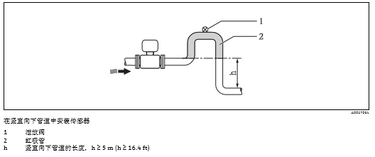 測(cè)量管中發(fā)生氣泡積聚現(xiàn)象時(shí),會(huì)增大測(cè)量誤差。因此,請(qǐng)避免在管道中的下列位置上安裝: • 管道的高點(diǎn) • 直接安裝在向下排空管道的上方 在豎直向下管道中安裝 在豎直向下管道(h ³ 5 m (16.4 ft))中安裝時(shí),需要在傳感器下游處安裝虹吸管或泄放閥,避免抽壓 時(shí)損壞測(cè)量管內(nèi)襯。此外,還可以防止液體短暫停滯在測(cè)量管中,產(chǎn)生氣障。